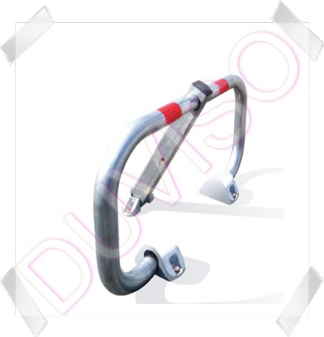 Elément de privatisation de place de parking ou de garage réalisé en tubes d'acier (Ø 50 mm et 60 x 40 mm) galvanisé et fourni avec des bandes réfléchissantes rouges à coller. Quatre angles arrondis. Equipé d'un pied télescopique et de sabots en fonte d'aluminium. Verrouillage automatique. Déverrouillage par clef (cylindre européen fourni avec clefs identiques) ou par clef triangle (en option). Fixation : par tire-fonds et chevilles d'expansion. Peut être équipé d'un système d'amortissement des chocs d'un véhicule effectuant une manoeuvre.