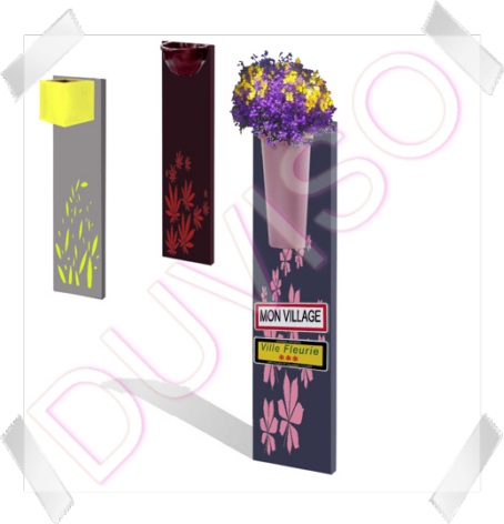 Structure entièrement réalisée en tubes carrés d'acier, de côtés 90 mm, galvanisé à chaud et thermo-laqué poudre polyester (RAL au choix) et d'une plaque de décor découpée au laser (épaisseur 3 dixièmes minimum) avec type de décor au choix. Equipée de traverses horizontales pour permettre la fixation de panneaux de signalisation. Peut être équipée de pots en applique (voir rubriques "jardinières" et "Pots en polyéthylène"). Fixation par scellement direct ou au moyen de fourreaux à sceller.